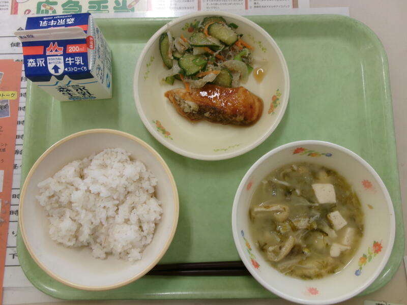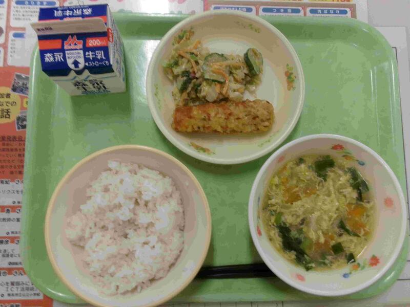 今日の給食:麦ごはん、にら玉スープ、ちくわ磯部天ぷら、野菜の梅マヨあえ、牛乳