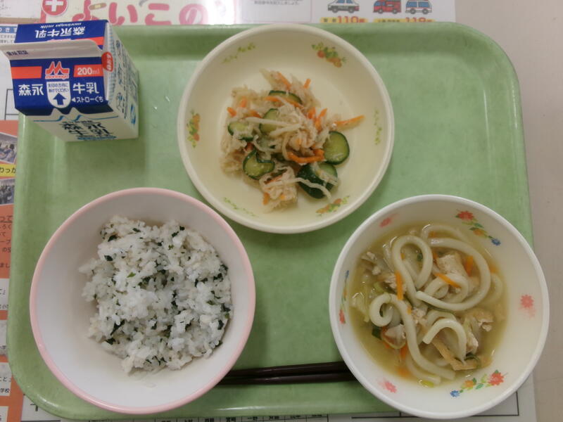 今日の給食:わかめごはん、きつねうどん、切干大根の酢の物、牛乳