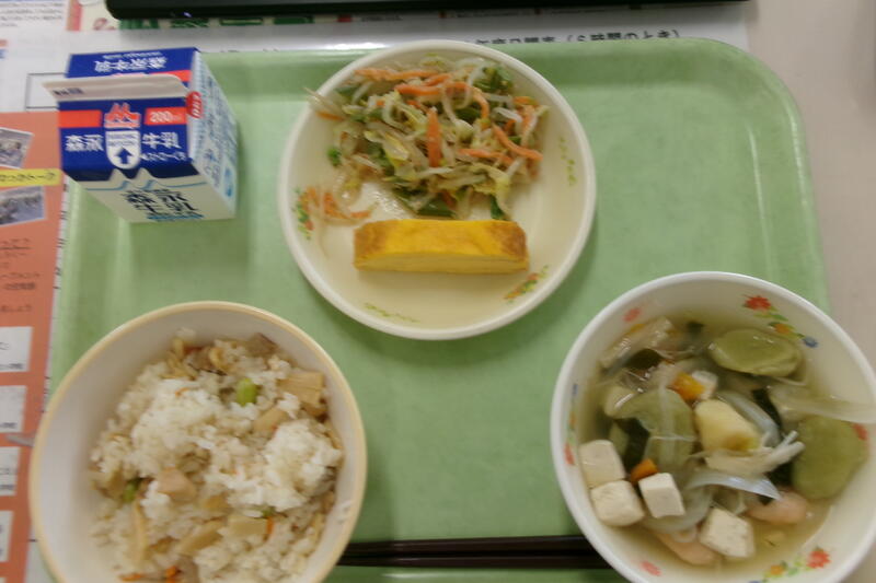今日の給食:たけのこごはん、つみれ汁、厚焼玉子、春野菜のごまあえ、牛乳
