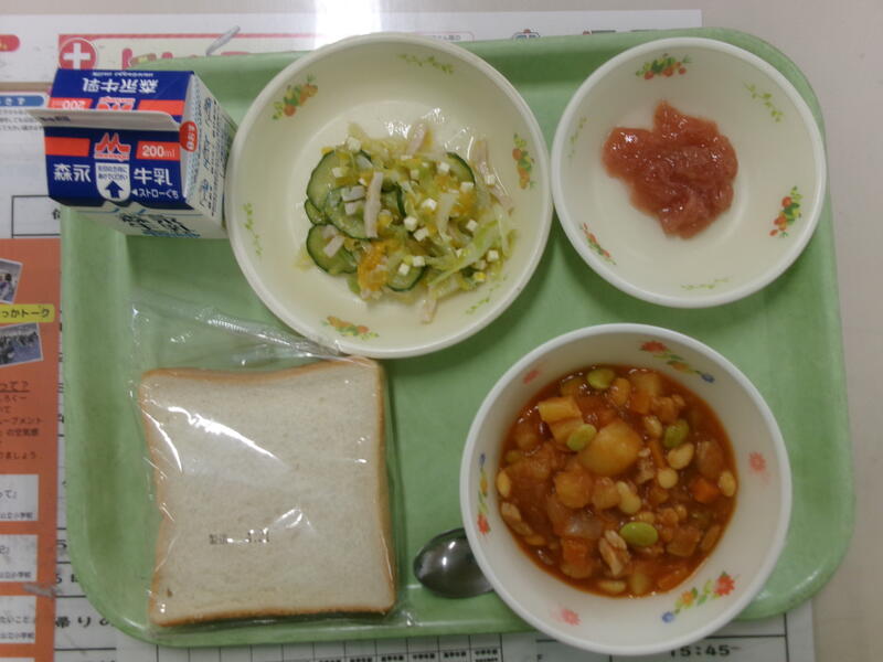 今日の給食:食パン、ポークビーンズ、ミックスサラダ、手作りいちごジャム、牛乳