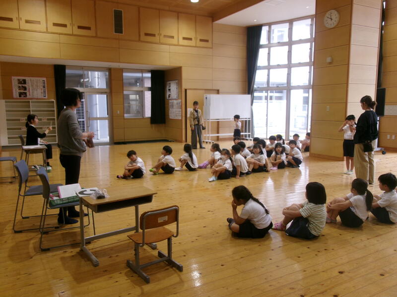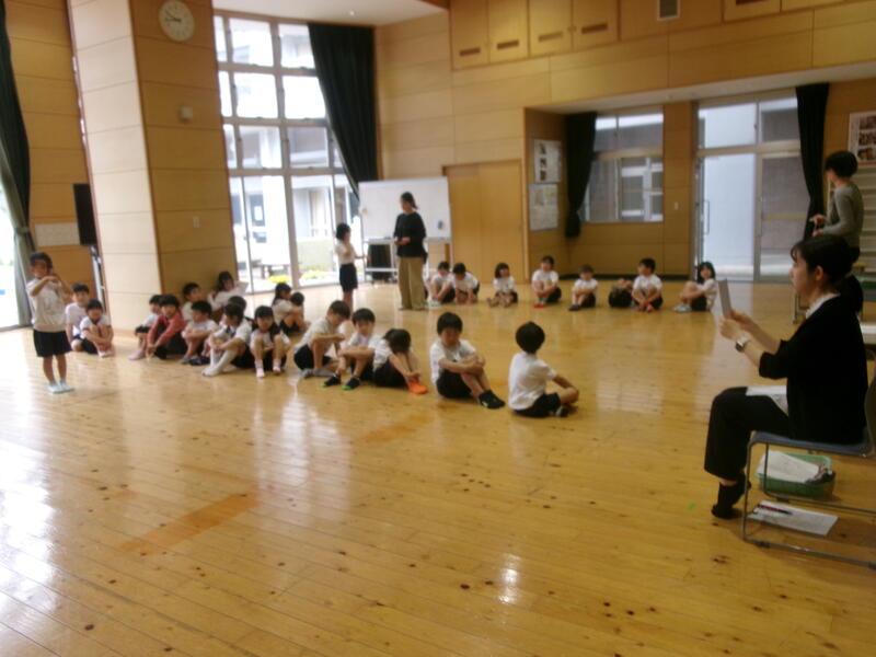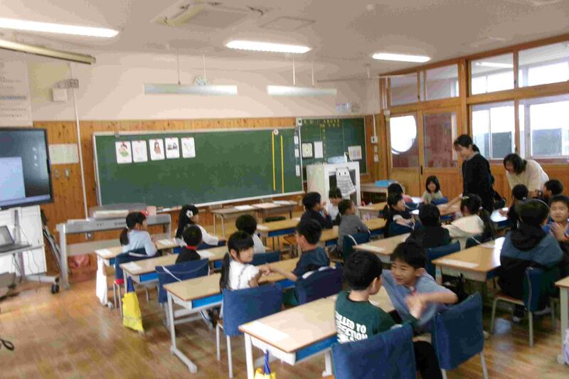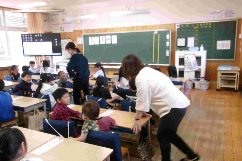 【1年2組:英語活動「あいさつの仕方」を楽しんでいました。】