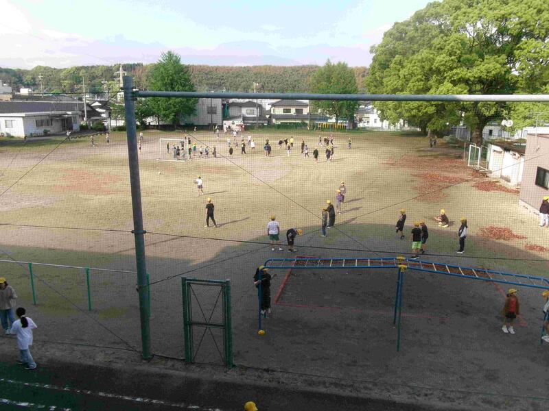 【御船小学校の朝は、子どもたちの元気のよいあいさつと、外であそぶ笑い声ではじまります。朝から多くの子どもたちが、ドッジボールやサッカー、うんていやブランコなどであそんでいました。 】