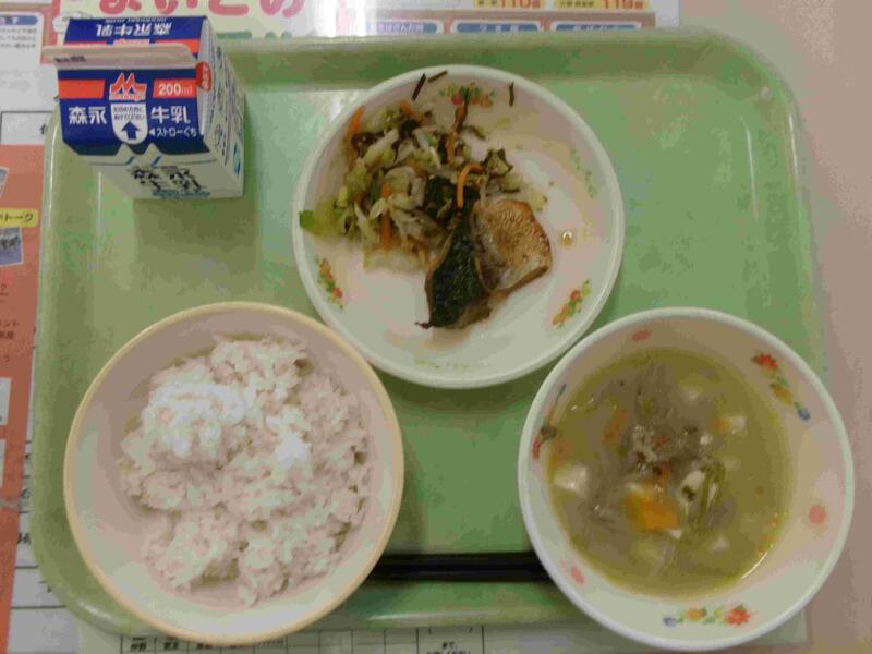 今日の給食:麦ごはん、豚汁、さばのソース煮、昆布あえ、牛乳