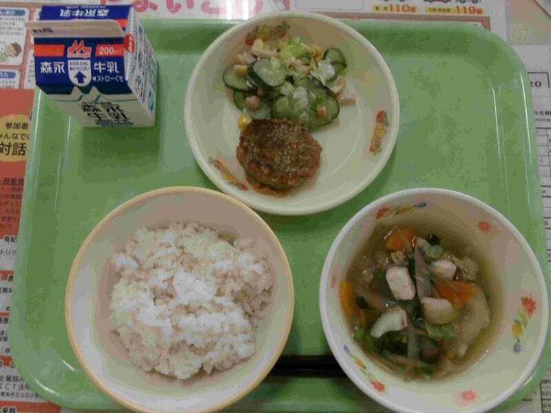 今日の給食:麦ごはん、鶏ごぼうスープ、ハンバーグのごまみそだれ、カリカリ豆サラダ、牛乳