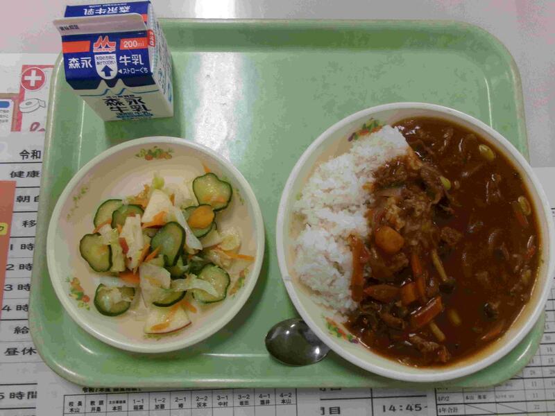 今日の給食:ハヤシライス、キャベツとりんごのサラダ、牛乳