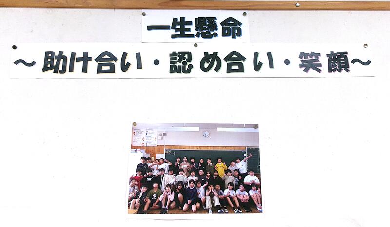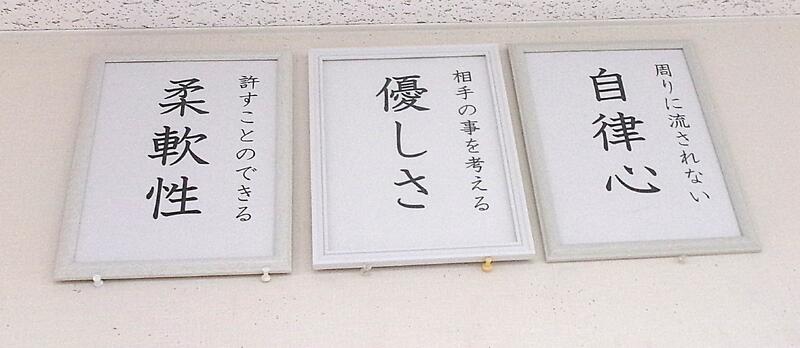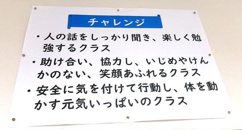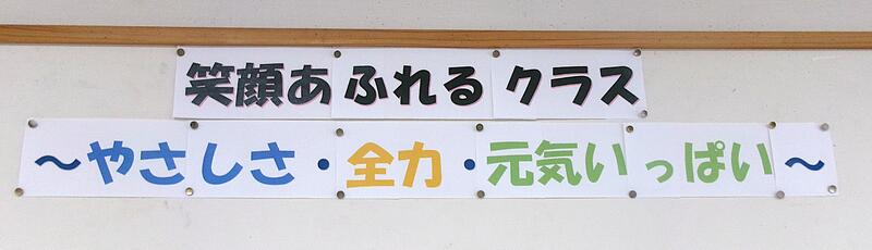 【本校では、掲示物の貼り方が決まっています。教室前面には、あまり何も貼らないこと。理由は、視覚的に刺激を受けやすい児童に配慮するためです。黒板上の所にいろいろな物が貼ってあると、集中できにくくなることがあります。そこで、全クラス学級目標は、教室後方に掲示するようにしています。今日は4年生、5年生、6年生の学級目標を紹介します。】