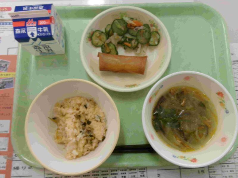 今日の給食:キムチごはん、中華スープ、春巻き、ゆかりあえ、牛乳