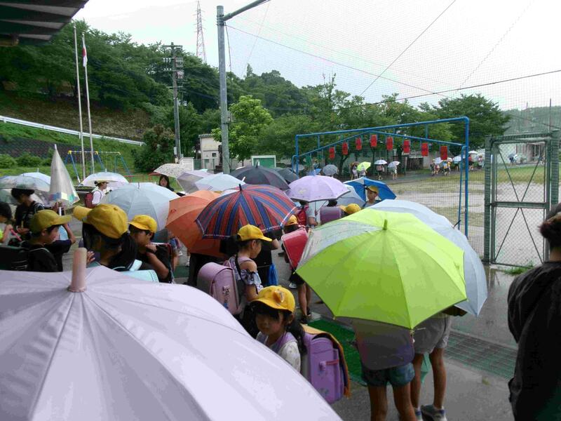 【1学期終業式:8時35分から体育館でおこないました。窓は全開、扇風機も準備しました。雨も降っていました。9時に式が終わりました。】
