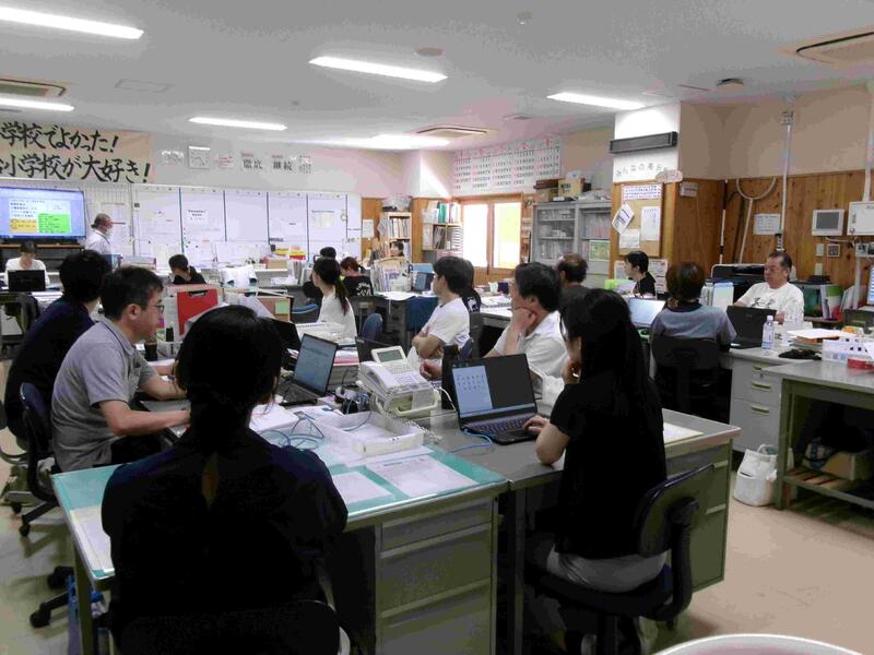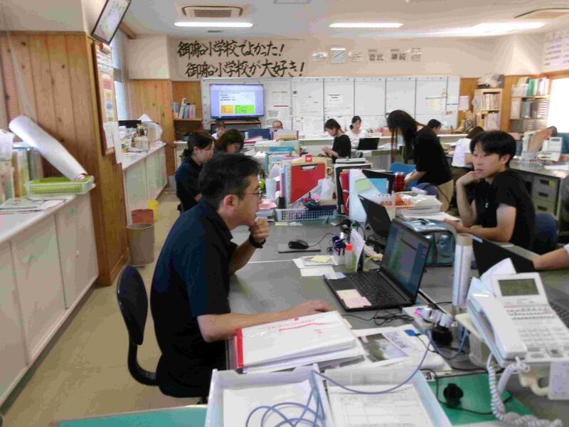 【御船小学校では、夏期休業期間中は午前8時25分から職員朝会がおこなわれます。その日の日程や連絡事項等の確認がされます。今日も多くの職員が出勤しています。仕事内容は、1学期の授業時数集計や各種レポート等の作成をおこなっています。】