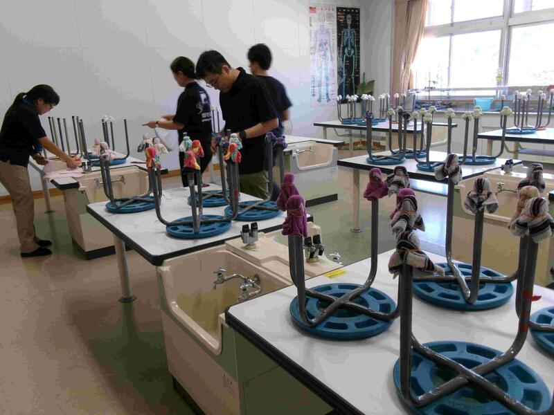 【今年の夏休み期間中の職員作業は、低・中・高に分かれ、それぞれ考えた場所で職員作業します。今日は高学年部が、理科室の丸椅子に、タオルを切って音が出ないような工夫をしていました。】