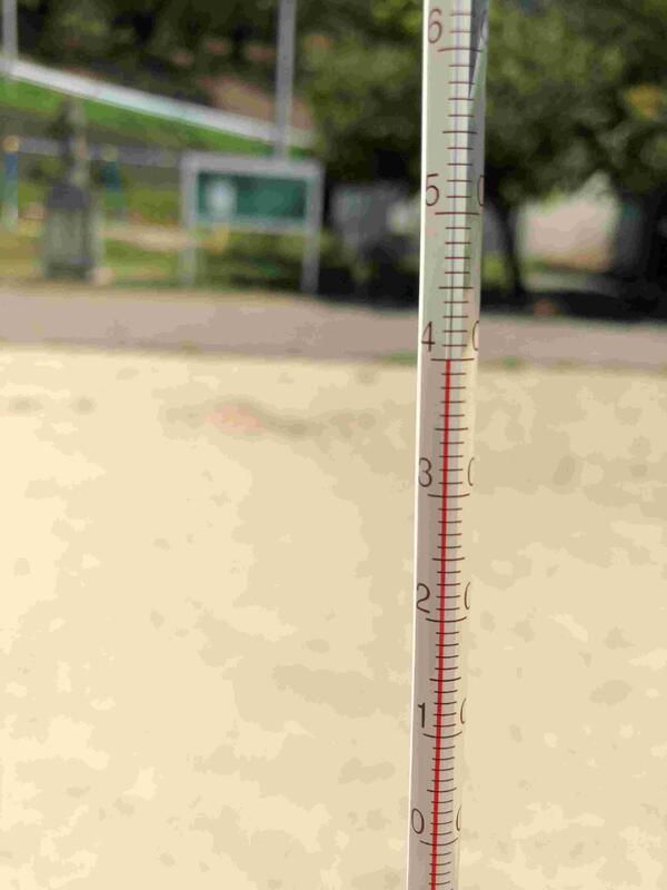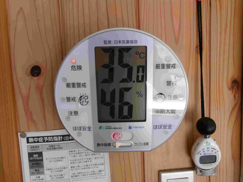 【昨日は「大暑」でしたね。昨日に劣らず、本日も暑かったですね。午後2時30分頃、運動場で気温を計ってみました。最初、室内で使っているデジタル温湿度計を運動場にしばらくおいていたところ、画面が真っ黒くなり、エラーがでました。室内にもどしたところ、正常に動きだしました。アルコール棒状温度計で計ってみました。ちょうど40度をさしていました。くれぐれも熱中症に気をつけ、過ごしてください。】