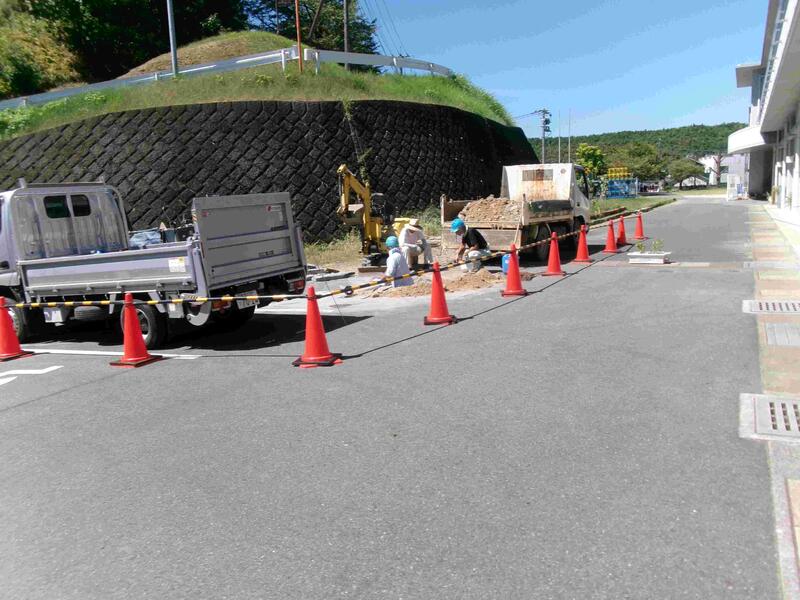 【朝から、工事車両が入りました。本校敷地内に、大きな貯水タンクを設置するための下準備作業だそうです。】