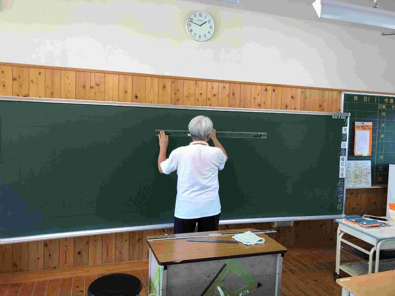 【子どもたちの学習効果をあげる手段の一つとして、「板書のくふう」があります。2年前の夏休みに、全クラスの黒板に10㎝×10㎝の方眼を、マジックで書きました。しかし、年月とともに薄れてきました。今日からまた、黒板に10㎝×10㎝の方眼を、マジックで書きはじめました。】