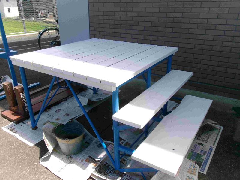 【午前中、木山邦博校長先生が、指令台の修理をされました。板が痛んでいたので張り替えられました。2学期運動会の時、指令台が活躍すると思います。】