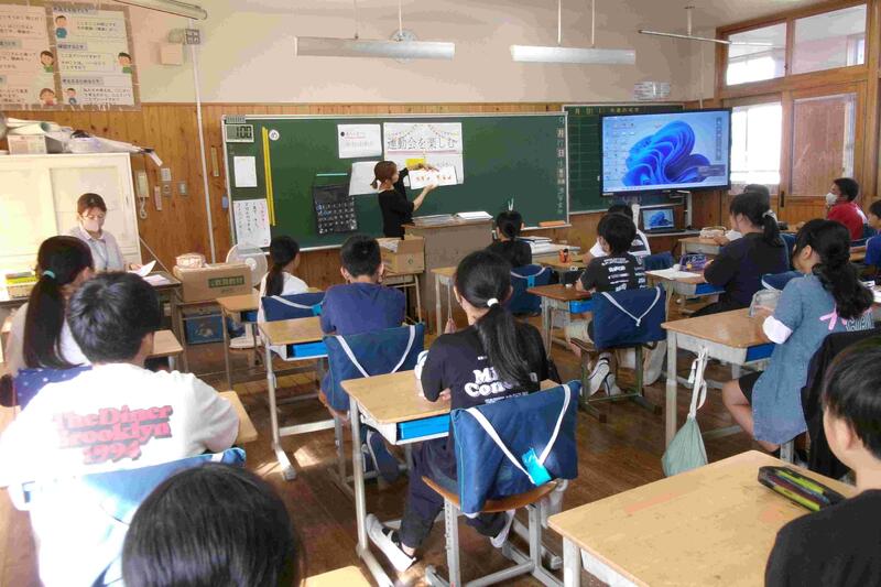 【5年生は英語の時間、ズームをつかい、小坂小と木倉小の5年生と「友だち紹介」の学習をしました。最初緊張していたようですが、話すうちにすぐに仲良くなっていました。】