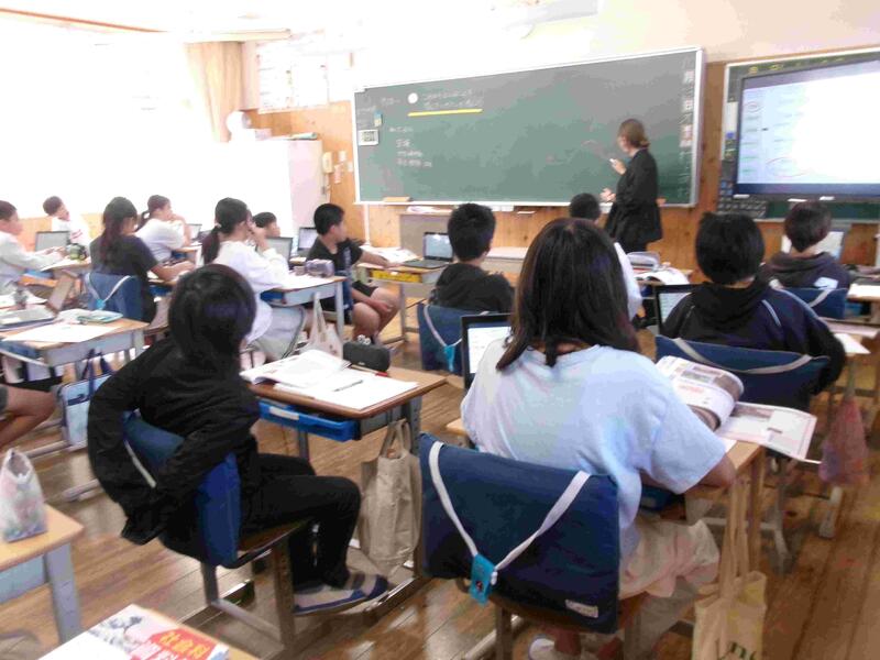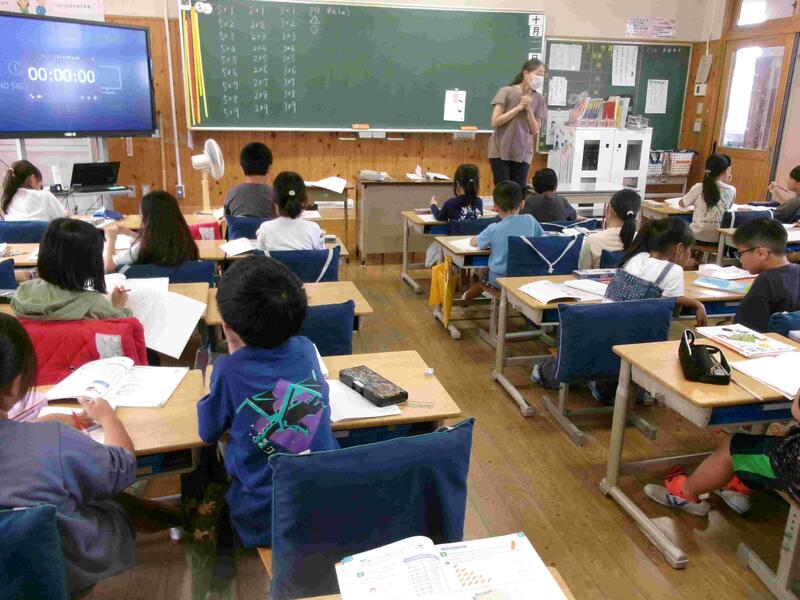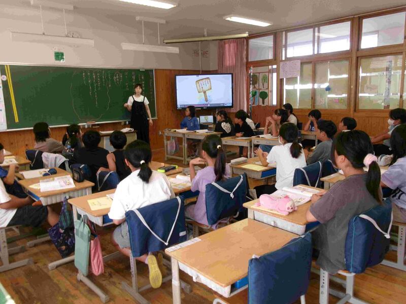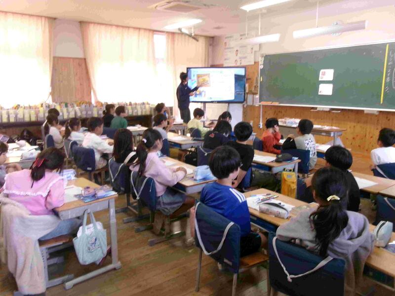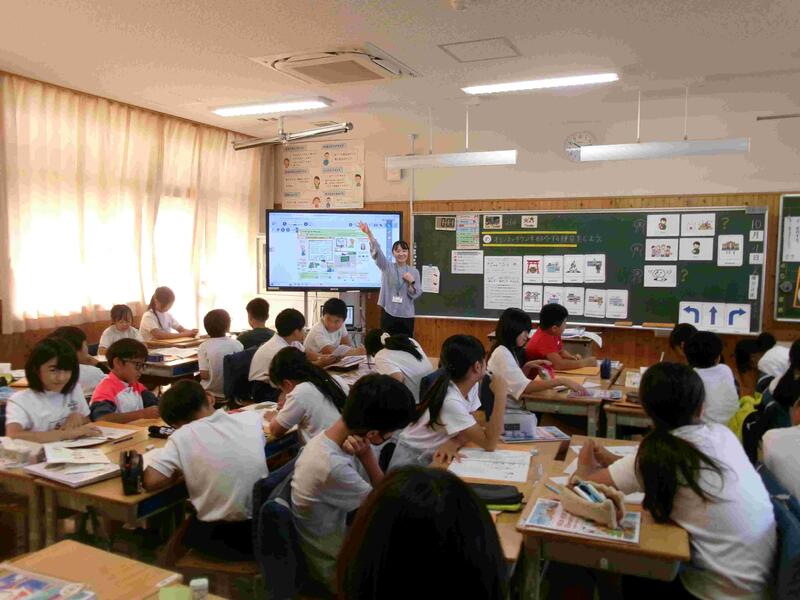【5年2組は英語活動で、小坂小外国語専科嶽本先生と、楽しく学習をしていました。内容は、「町紹介を英語でしよう。」です】