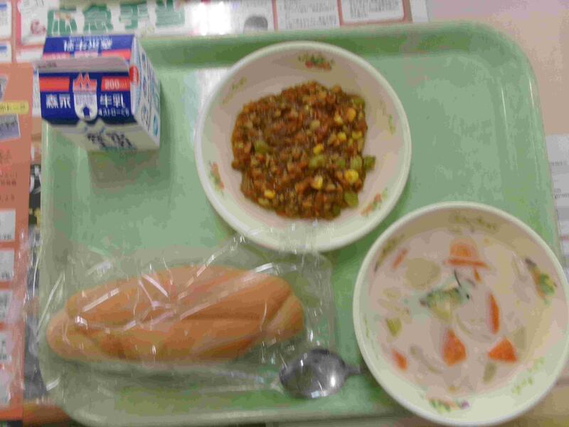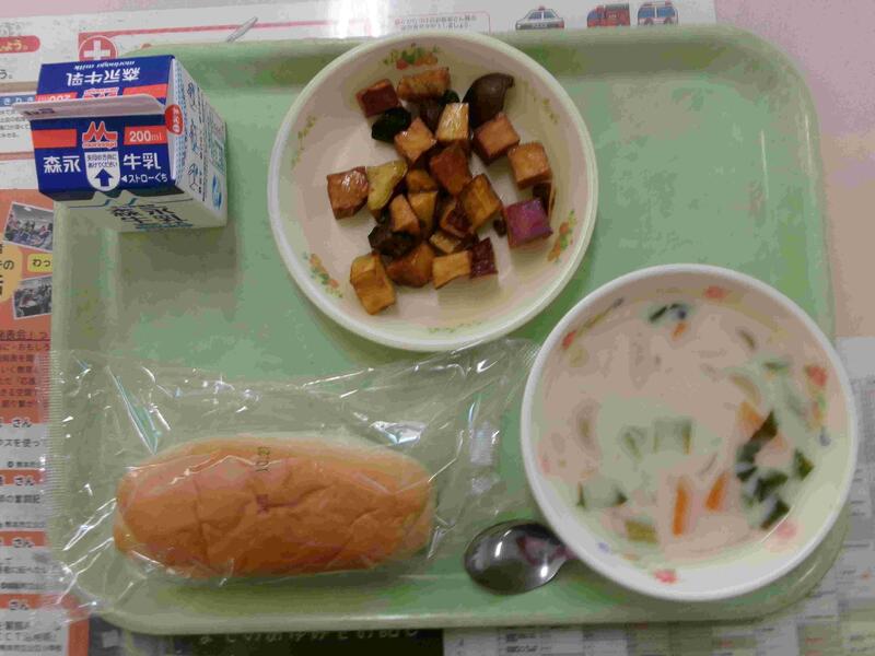 今日の給食:ミルクパン、チンゲンサイのクリームスープ、おさつレバー、牛乳