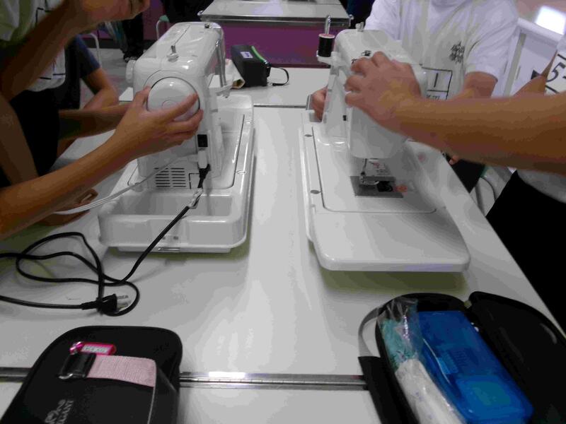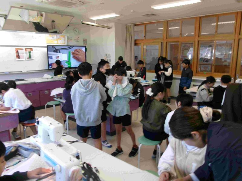 【5年1組は家庭科で、ミシンをつかって、ナップサック作りをしていました。】