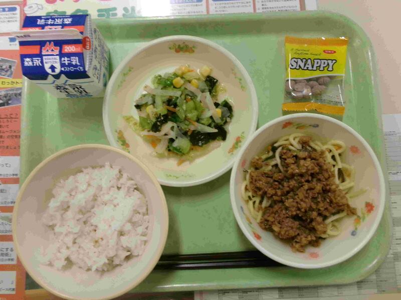 今日の給食:麦ごはん、タンタン麺、チョレギサラダ、一食黒糖ビーンズ、牛乳