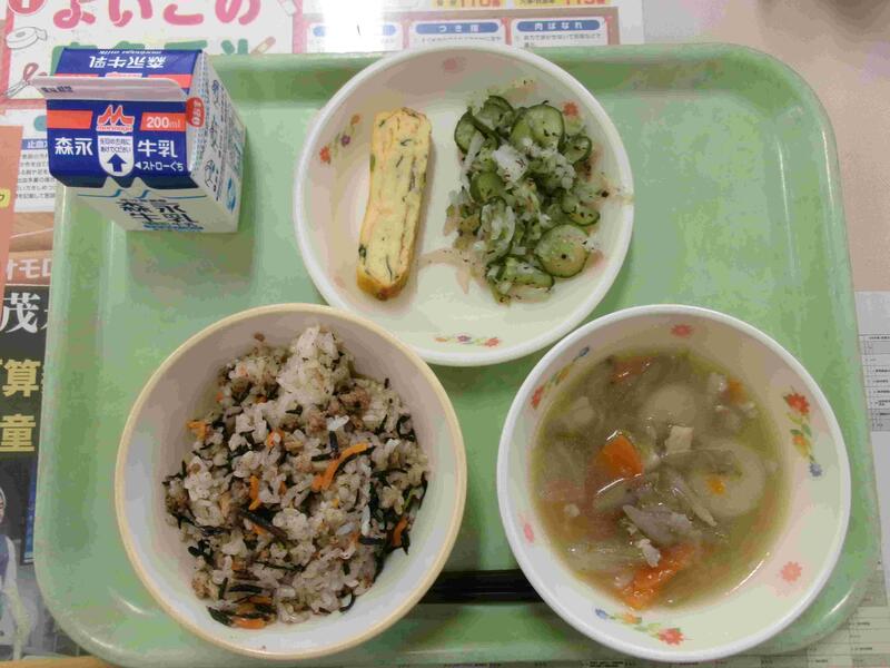 今日の給食:ひじきごはん、秋の里の団子汁、厚焼きたまご、キャベツのしそあえ、牛乳