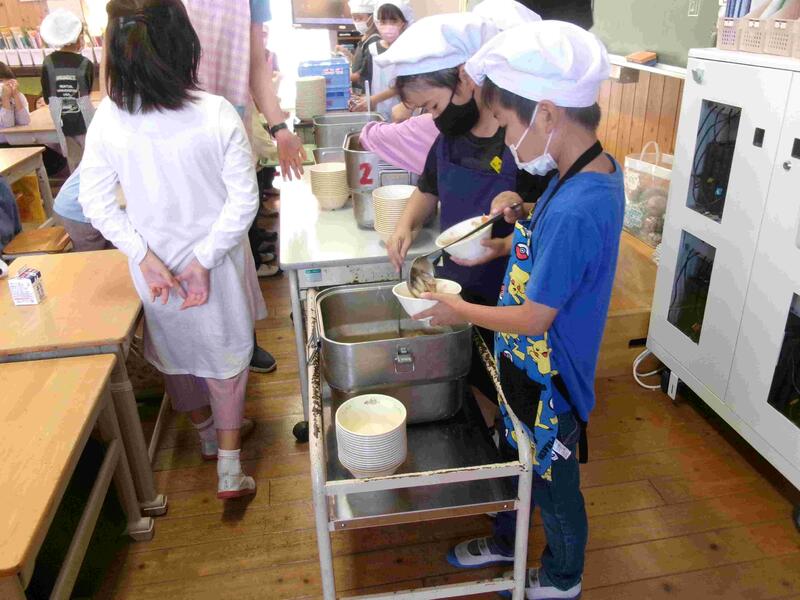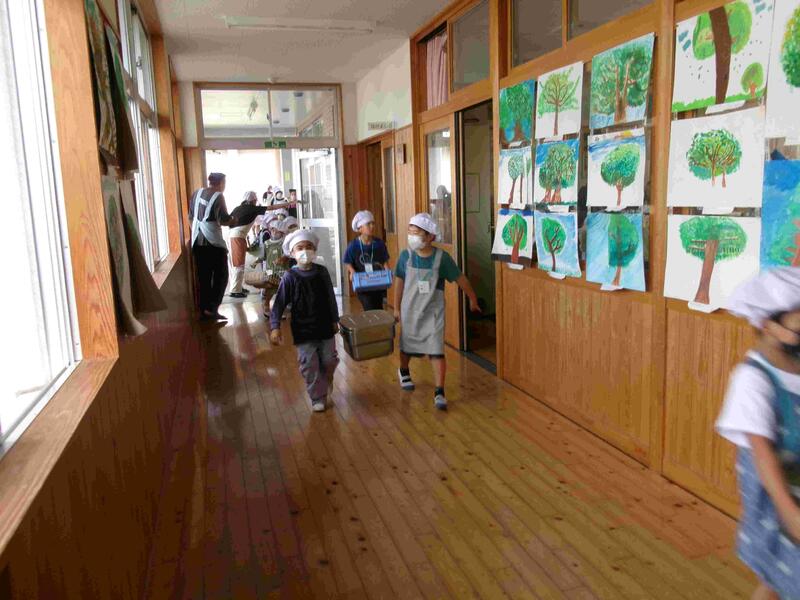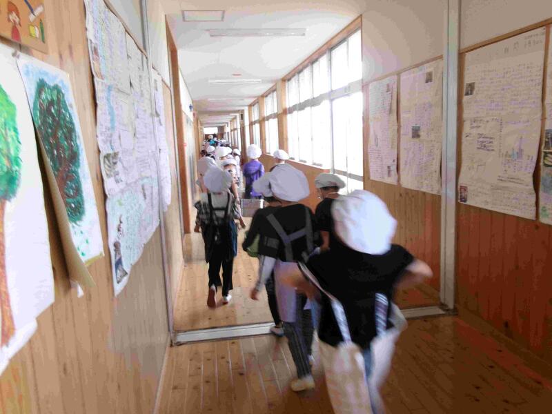 【給食の準備の様子です。廊下に一列に並んで進んでいます。準備の映像は2年生です。2年生は担任や支援員の先生方の手を借りることなく、自分たちでつぎ分けることができています。】