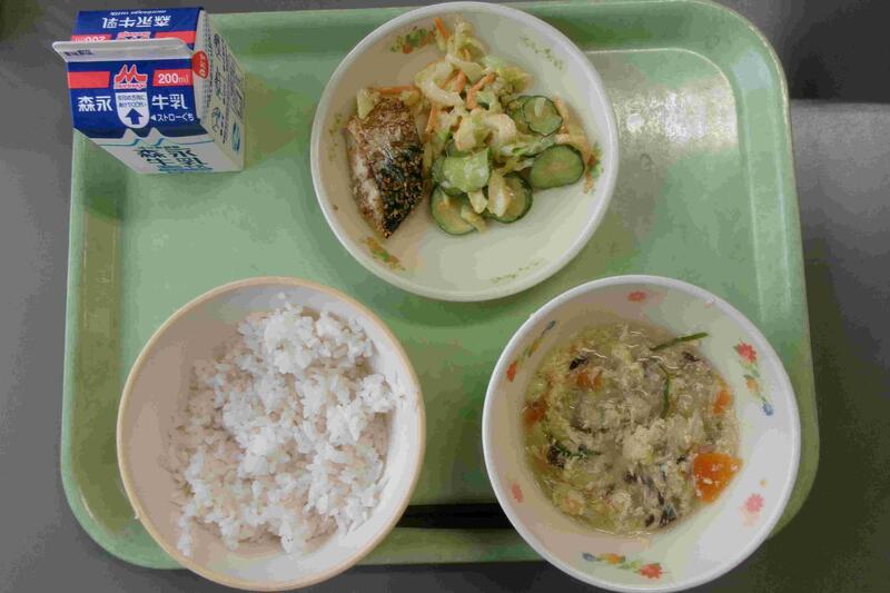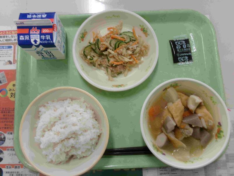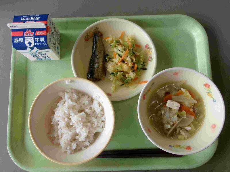 今日の給食:麦ごはん、さつま汁、いわしのしょうが煮、千草あえ、牛乳