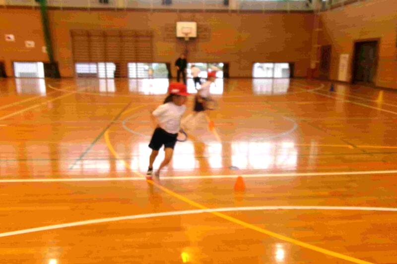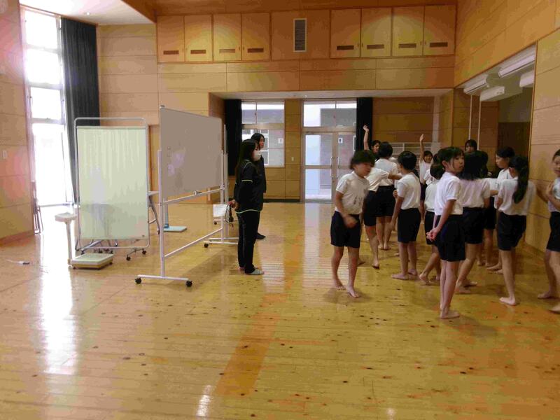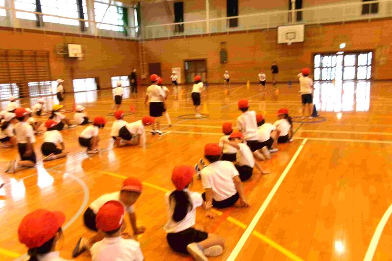 【1年生の体育は、体育館でおこなわれていました。リレーの中に、くるりと1回転する活動の入ったリレーをおこなっていました。】
