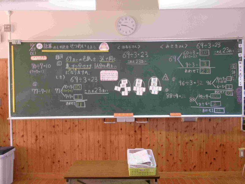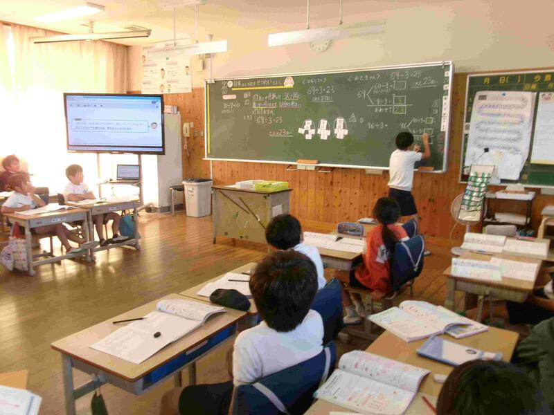 【3年1組、「大きい数のわり算」の学習の様子です。電子媒体と紙媒体をまぜながら授業を進めています。】