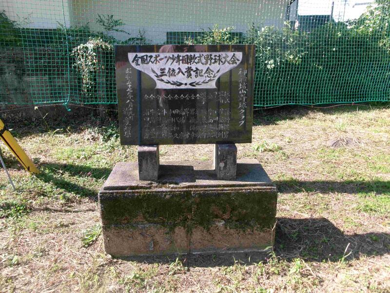 【運動場南側にある記念碑です。昭和57年8月、愛知県で開催された「全国スポーツ少年団軟式野球大会」で、御船城山野球クラブが見事第3位になったことを記念し、建てられた記念碑です。】
