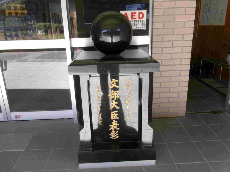 【職員玄関前にある記念碑です。平成5年、御船小学校PTAが文部大臣表彰を受けた時の記念碑です。】
