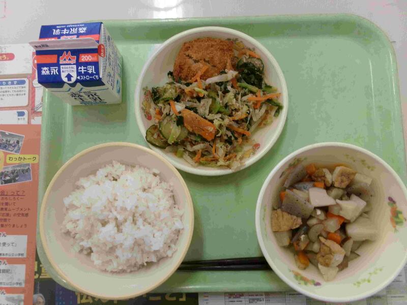 今日の給食:麦ごはん、ぐる煮、土佐あえ、かつおのフライ、牛乳