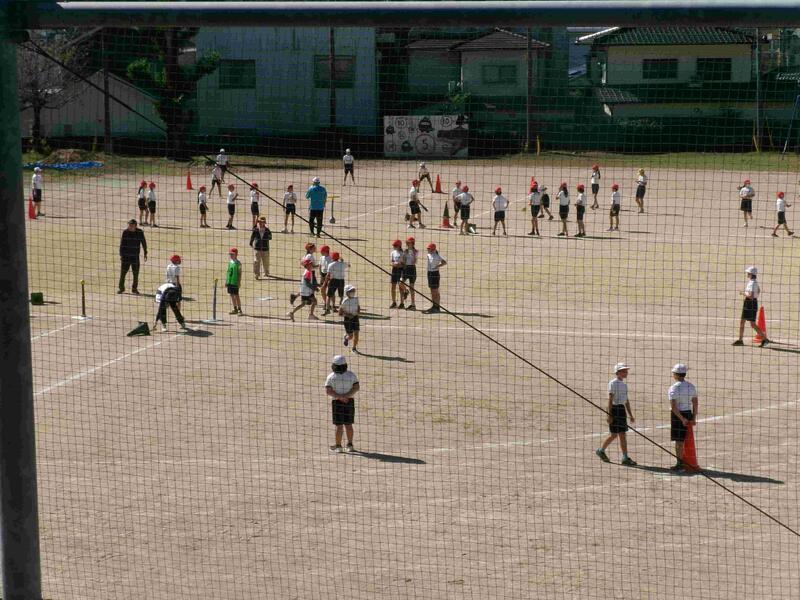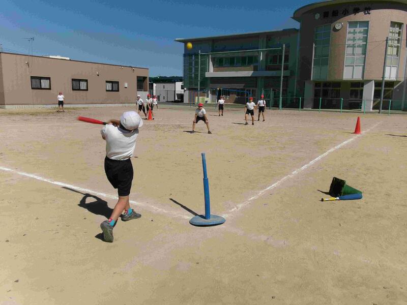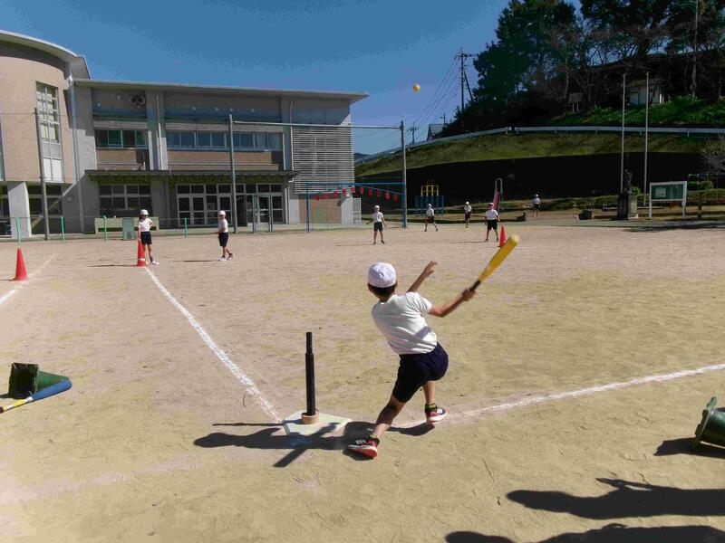 【5年生の体育は現在「ティーボール」をしています。写真を撮りに行った時、女の子から「先生ティーボールたのしいー」という言葉を聞きました。盛り上がっている「ティーボール」です。】