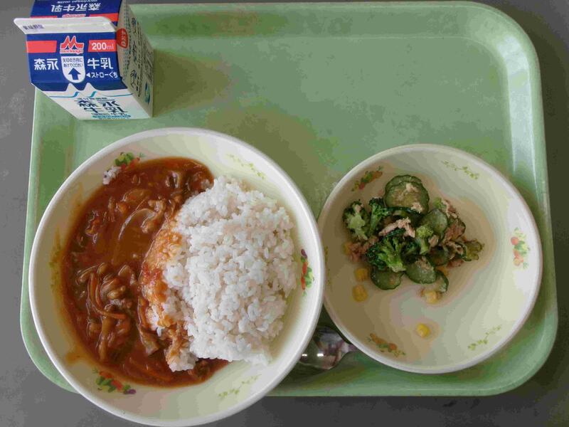 今日の給食:ハヤシライス、ツナとブロッコリーのサラダ、牛乳