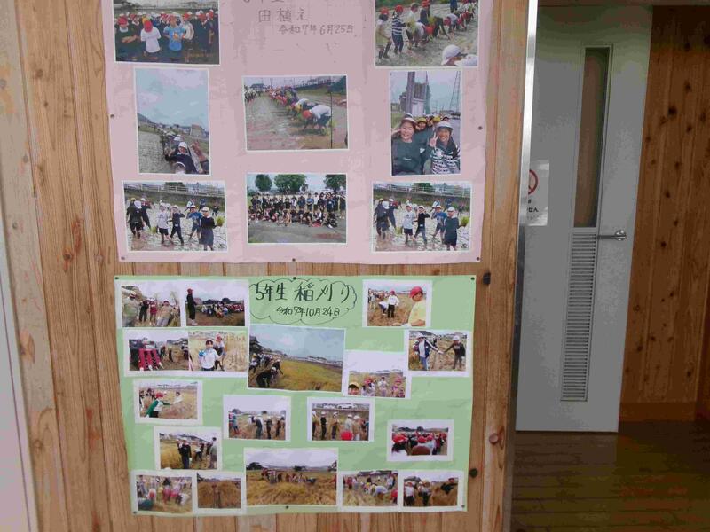 【5年生の掲示板です。田植えと稲刈りの写真が掲示してあります。】