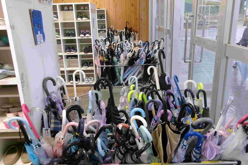 朝の様子です。雨が降っていたので児童は傘をさして登校です。靴箱前では、傘についた水滴を落とし、傘をクルクルっとたたんで傘入れに入れています。感心な御船っ子たちです。