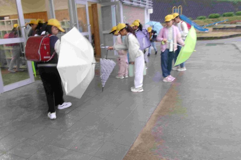 【今日は朝から雨が降っていました。傘をさしてきた子どもたちです。傘をきちんとたたみ、傘立てにたてています。】
