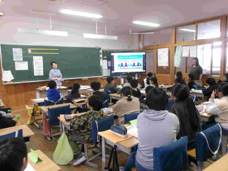 【5年1組:英語の歌「レストランへようこそ」を元気よく歌っていました。英語で覚えたら、次は楽しい動作を入れるそうです。】