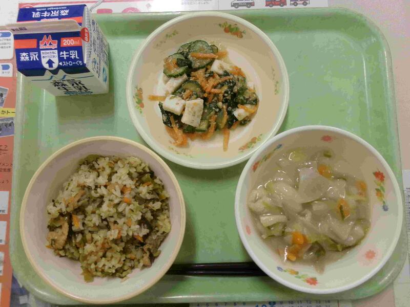 今日の給食:高菜ごはん、だんご汁、いかの酢味噌あえ、牛乳