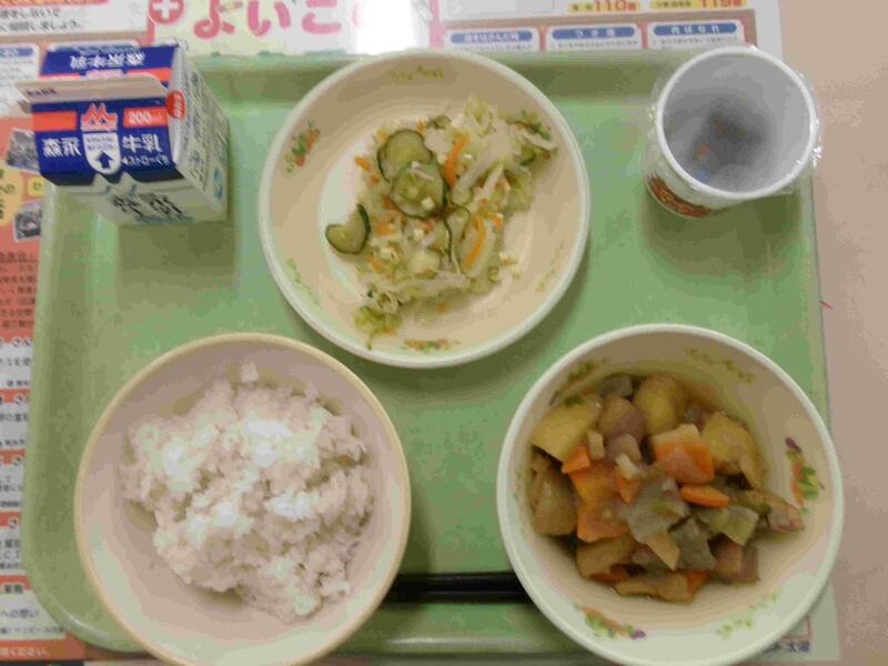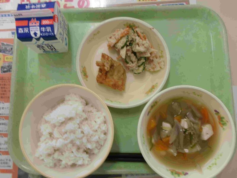 今日の給食:麦ごはん、けんちん汁、鶏のから揚げ、れんこんのサラダ、牛乳
