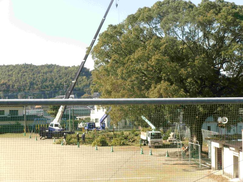 【朝から、大クスの剪定がおこなわれました。お世話になりました。】