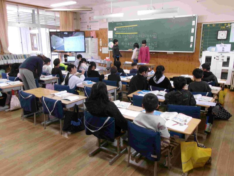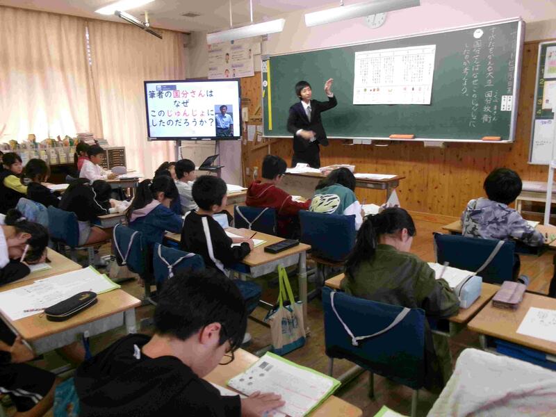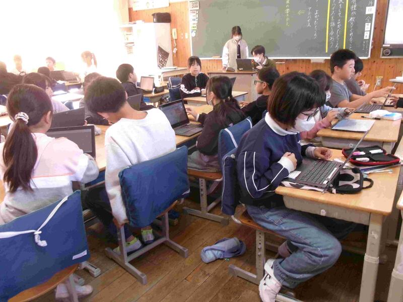 【5年2組:国語でタブレットをつかって、個人個人のよかったところなどを発表していました。タブレットの使い方として、まず自分の考えを、自分のタブレットに入力します。書き終えたら、教師のフォルダーに転送します。教師がクラス全員の考えを電子黒板に表示します。このような流れで学習が進んでいます。保護者の皆様の時代は、タブレットがなかったと思います。授業のやり方も以前とは大きくかわっています。】