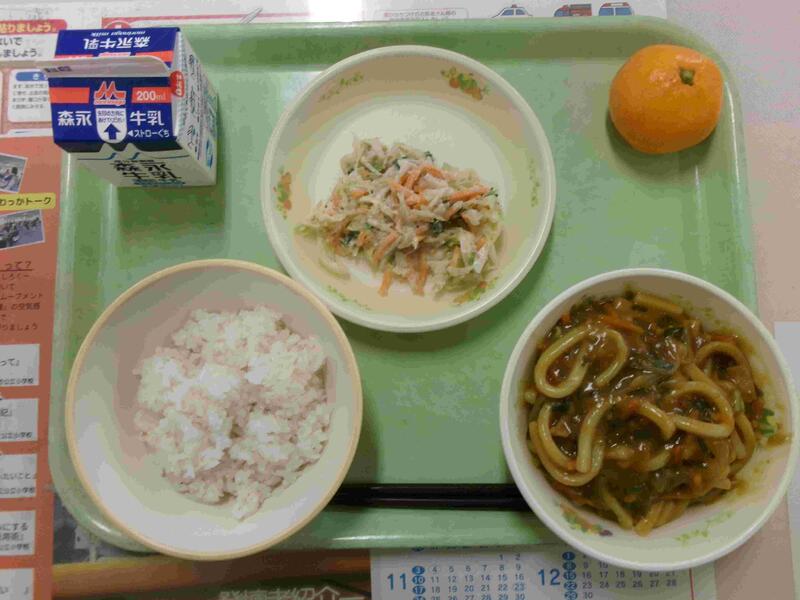 今日の給食:麦ごはん、カレーうどん、チンゲン菜とささみのサラダ、みかん、牛乳