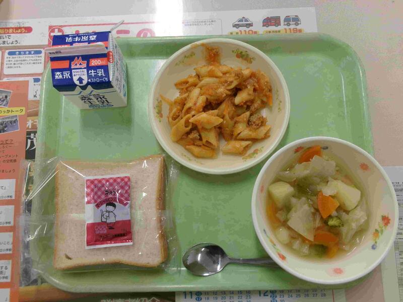 今日の給食:食パン、ポトフ、ペンネアラビアータ、大豆チョコクリーム、牛乳