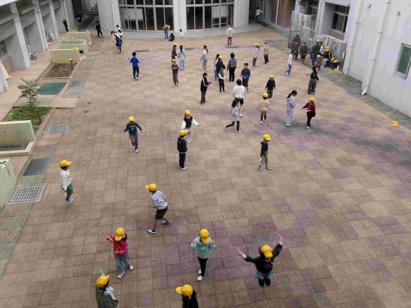 【昼休みの様子です。中庭では、多くの子どもたちが、なわとびをしています。】