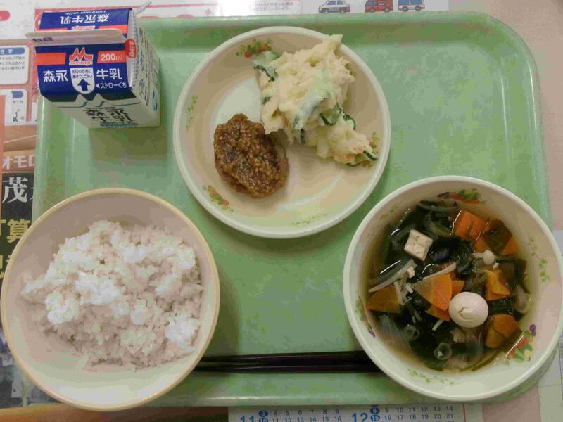今日の給食:ふるさとくまさんデー ~ましきまち~ 麦ごはん、うずらの卵のすまし汁、ハンバーグのごまみそだれ、ダブルポテトサラダ、牛乳