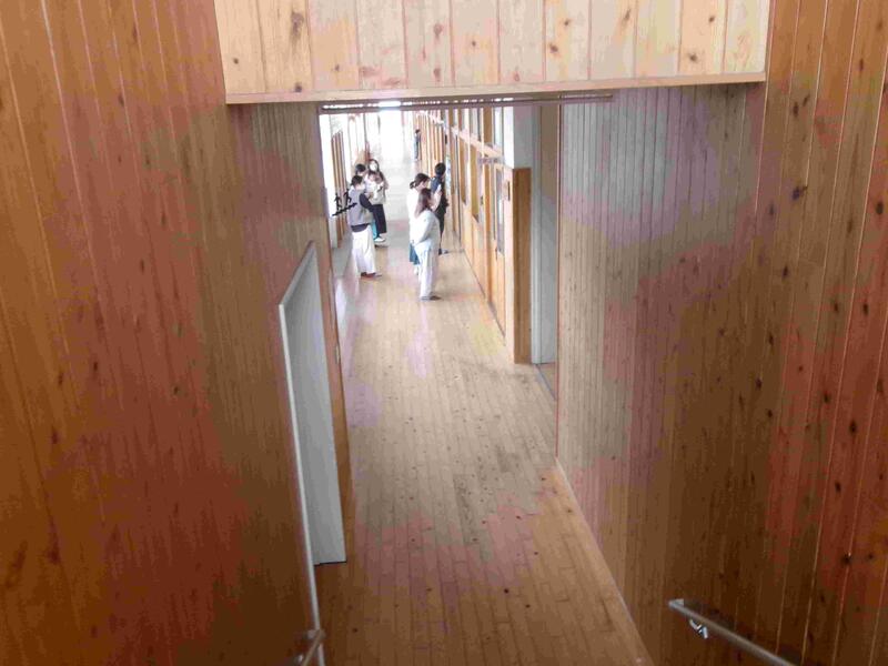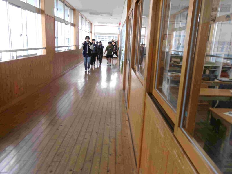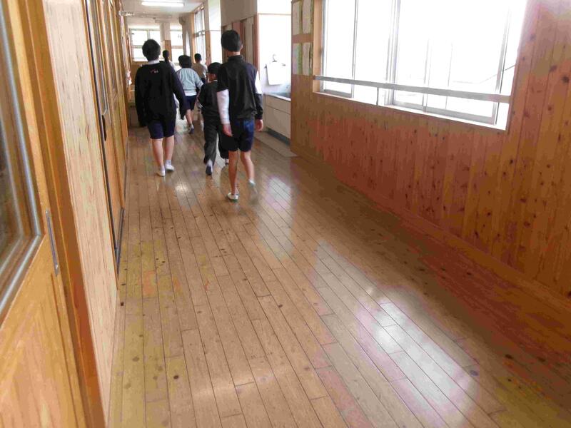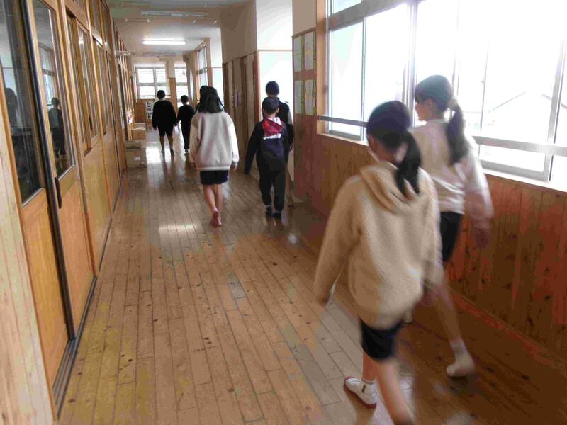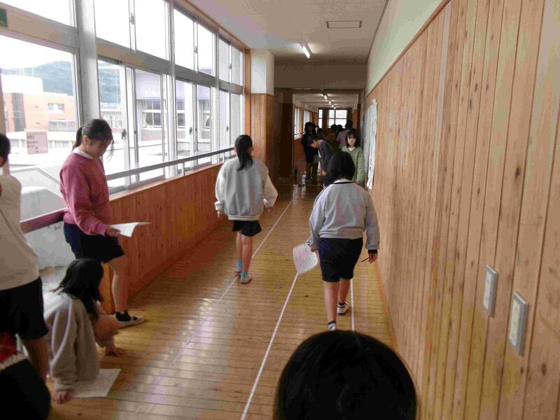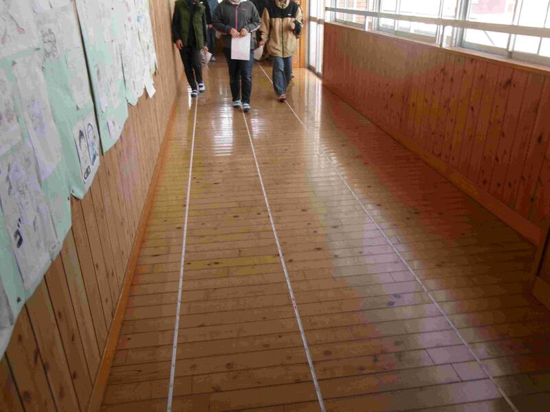 【5年生は算数で「平均」の学習をおこないました。そのまとめとして、自分の10歩の歩幅の平均をもとめ、1歩の長さを求めました。2階の廊下は長方形の形でつながっています。1周の距離を求めてみました。ちなみに1周154mです。この長さに近い児童も数人いました。】