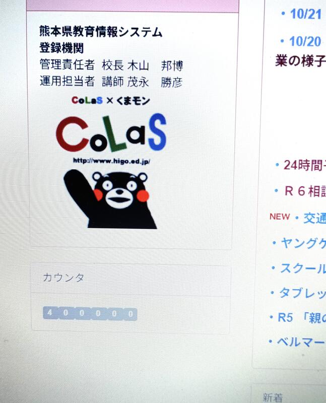 【昨日11月20日、午後6時5分に御船小学校ホームページ閲覧者数が40万人になりました。パソコンやスマホから、同じ機種では、1日何度開いてもカウントは1回です。午後5時50分ごろ、39万9990人ぐらいだったので、1分おきに閲覧者をみていました。40万人目が午後6時5分でした。2学期からの閲覧者数は一日平均267人です。今後もよろしくお願いします。】