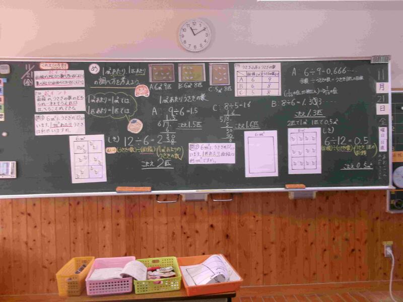 【5年生の算数です。「こみぐあい」を学習しています。今日は、1㎡あたりのうさぎの数や1ぴきあたりの面積を学習しました。教科書ではA:面積6㎡、うさぎ9匹。B:面積6㎡、うさぎ8匹。C:面積5㎡、うさぎ8匹となっています。最初にこの問題をせず、次の問題を出しました。問題1:6㎡にうさぎが12匹います。1㎡あたりうさぎは何匹いますか。まず、「~あたり」と言う言葉の意味を考えました。子どもたちから「1㎡あたり」は「1㎡では、1㎡につき」と考えればいいのではないかと出てきました。図を使い1㎡あたり2匹のうさぎがいることがわかりました。答えが2匹になるにはどんな式をたてればよいか考えました。つまり12(うさぎの数)÷6(面積)=2(1㎡あたりのうさぎの数)言葉の式をたて、A、B、Cの場合を考えていきました。難しい単元ですですが、がんばっている子どもたちです。】