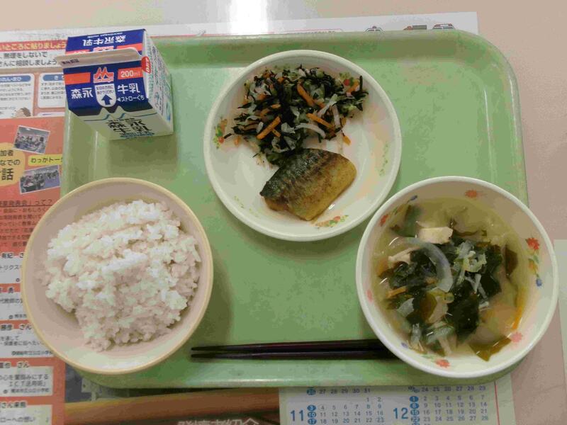 今日の給食:麦ごはん、白菜のみそ汁、さばのカレー醤油漬け、ひじきのサラダ、牛乳