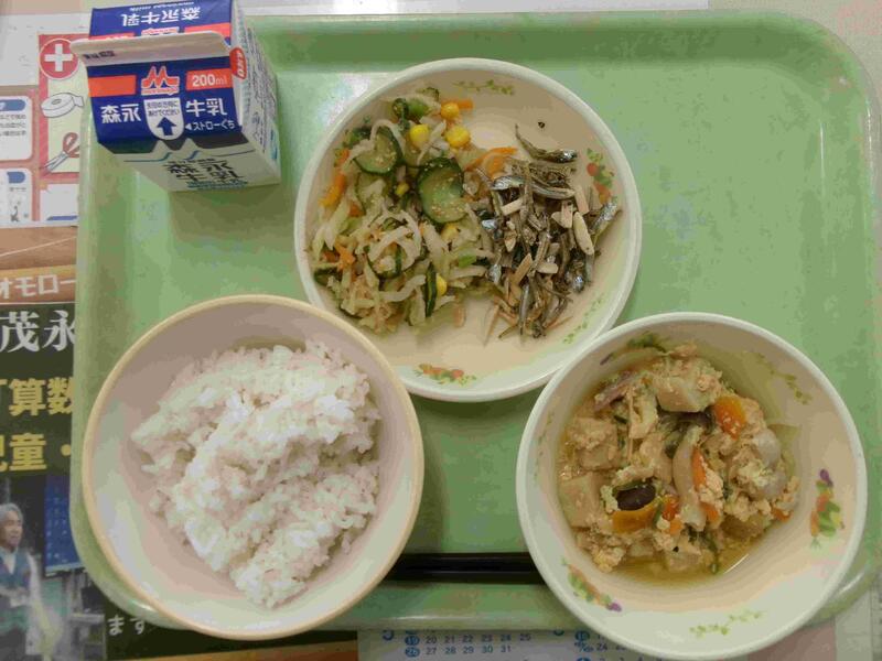 今日の給食:麦ごはん、高野豆腐の卵とじ、切り干し大根の酢の物、いりこアーモンド、牛乳